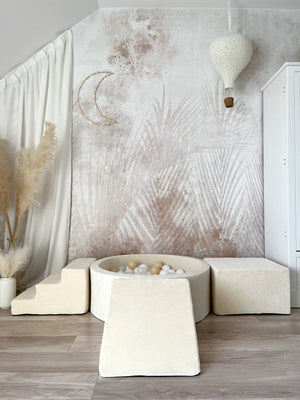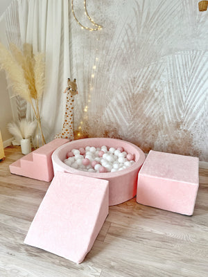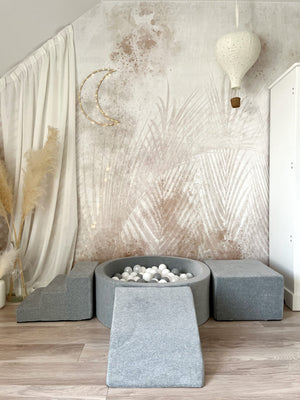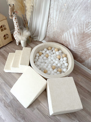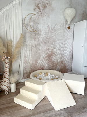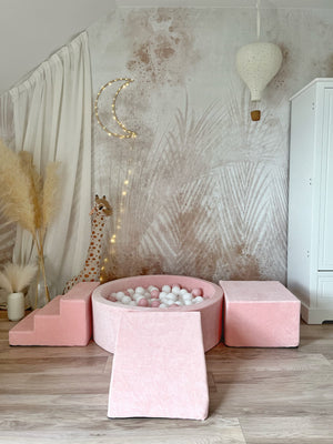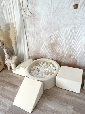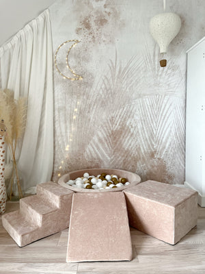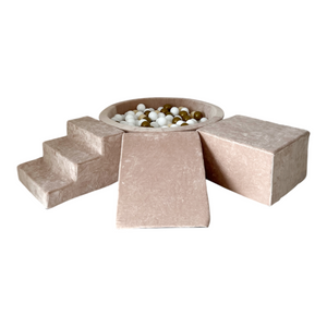 Dodejte hraní luxusní nádech s naší sametovou pěnovou hrací sadou s bazénkem – měkkým, stylovým a bezpečným prostorem, kde si děti mohou lézt, klouzat a objevovat. Ideální do dětského pokoje, herniček nebo k vytvoření útulného hracího koutku kdekoliv.