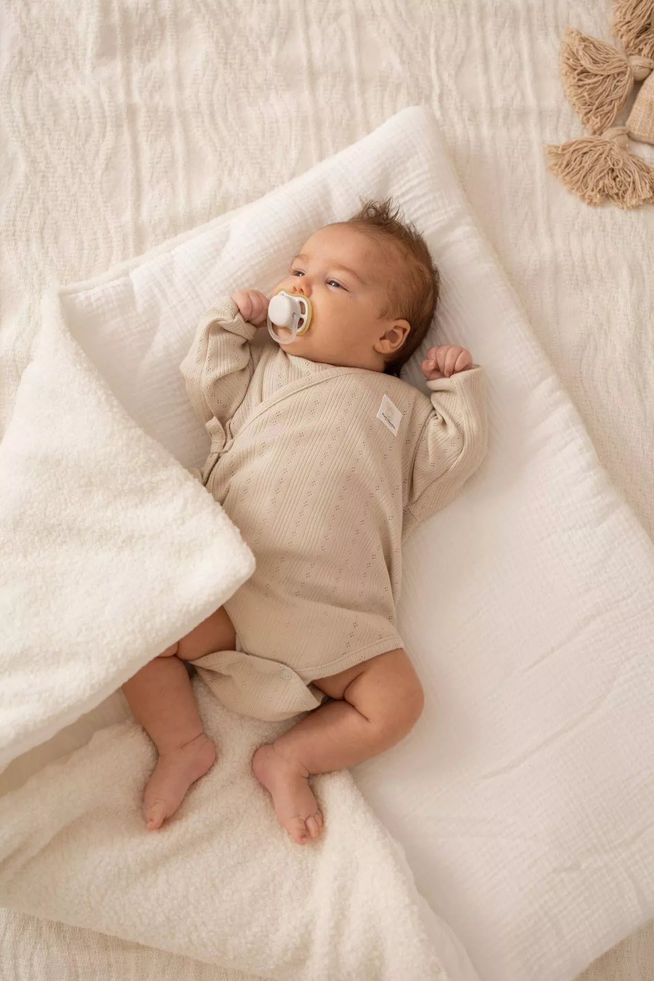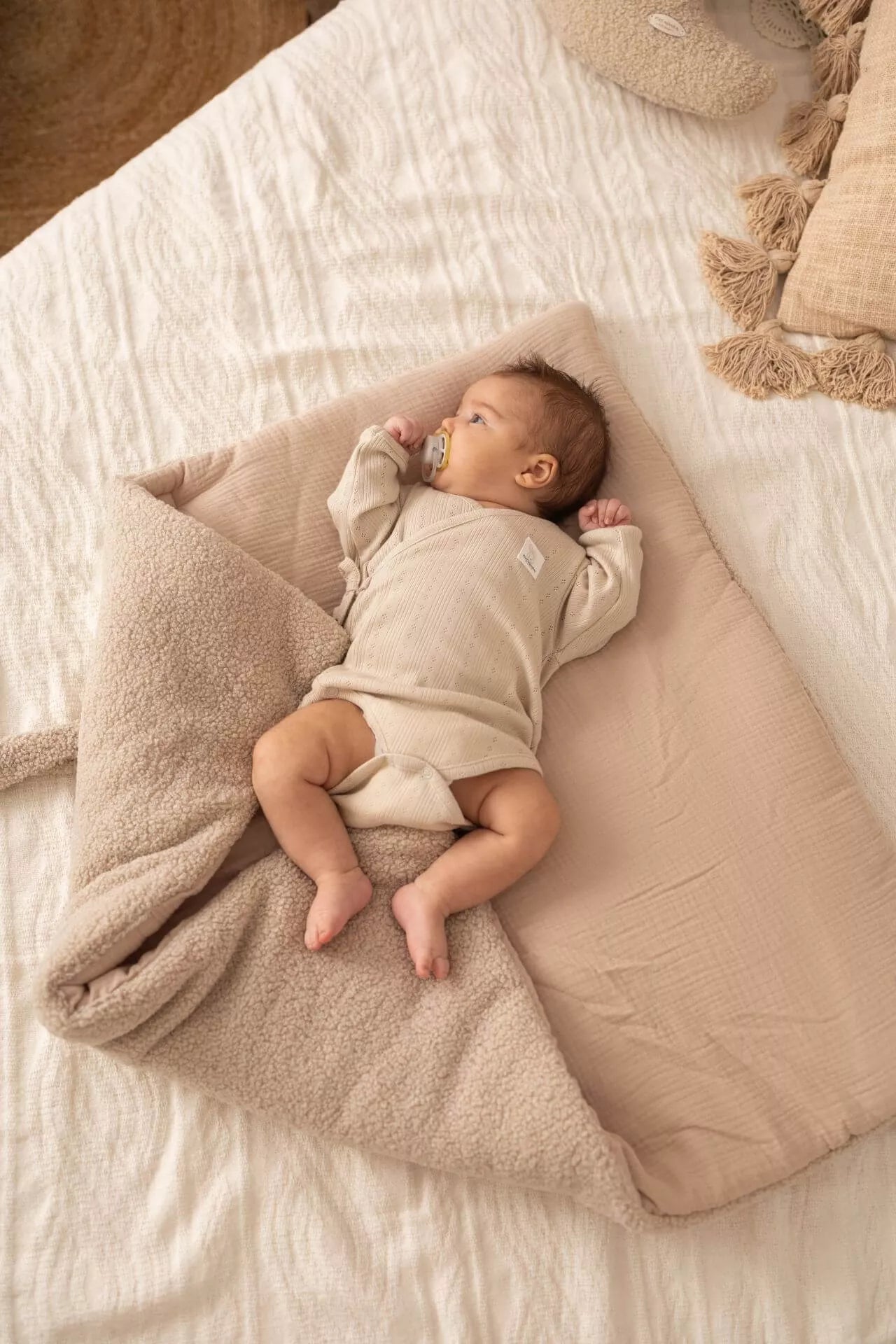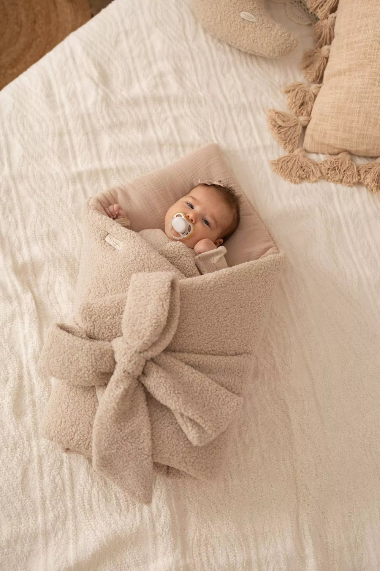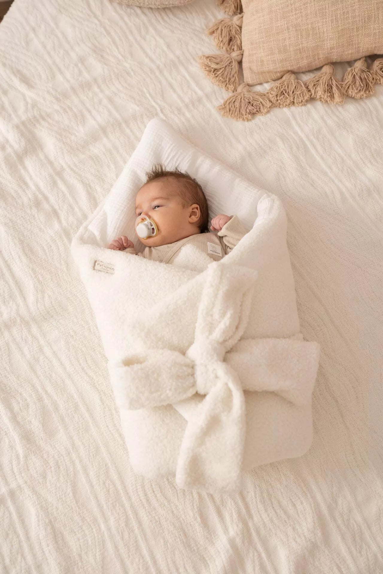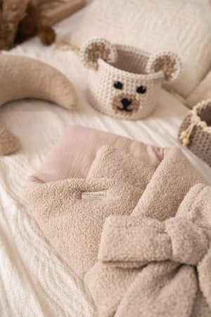 - Materiál: Vnější strana – bouclé látka; vnitřní podšívka – 100% mušelínová bavlna