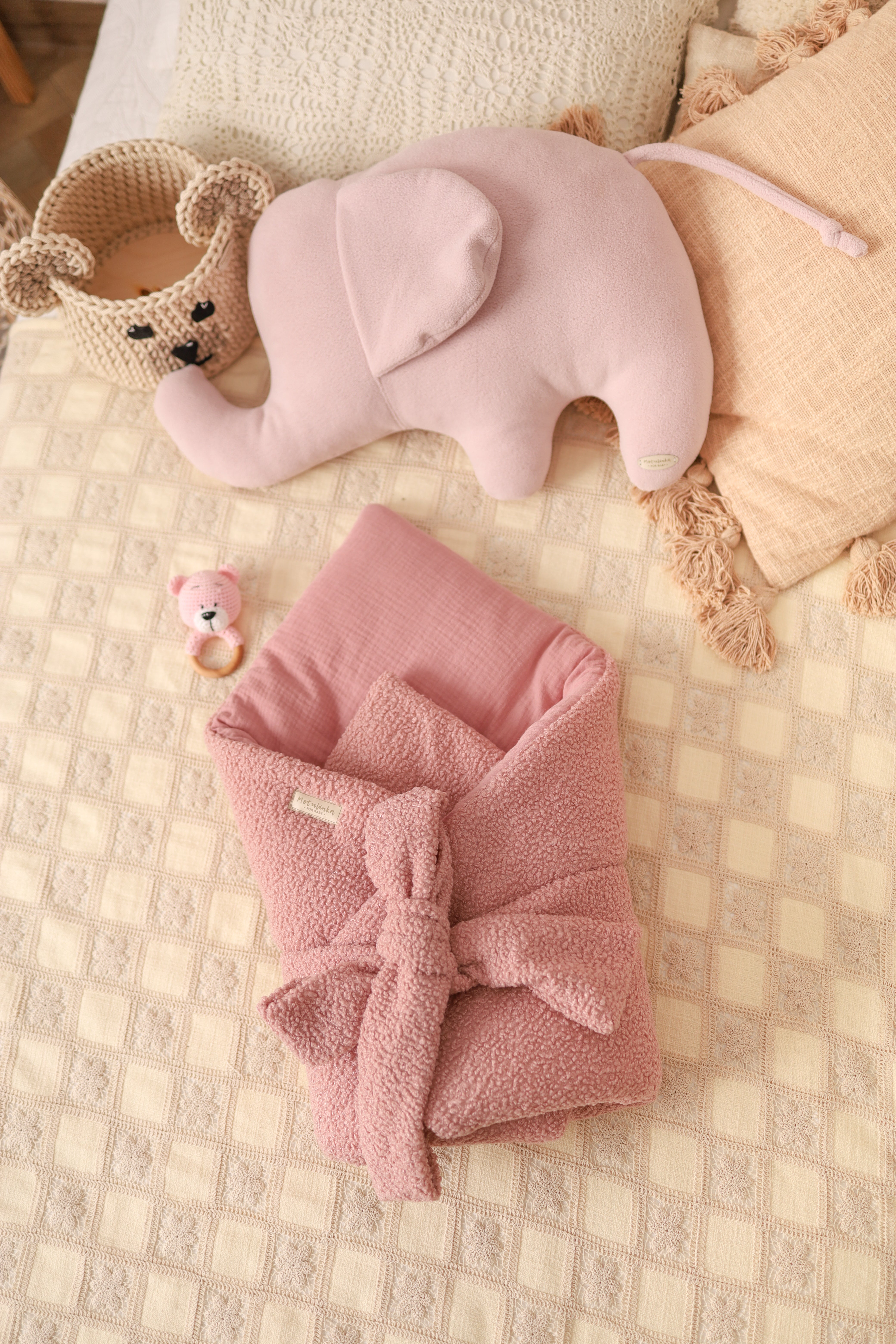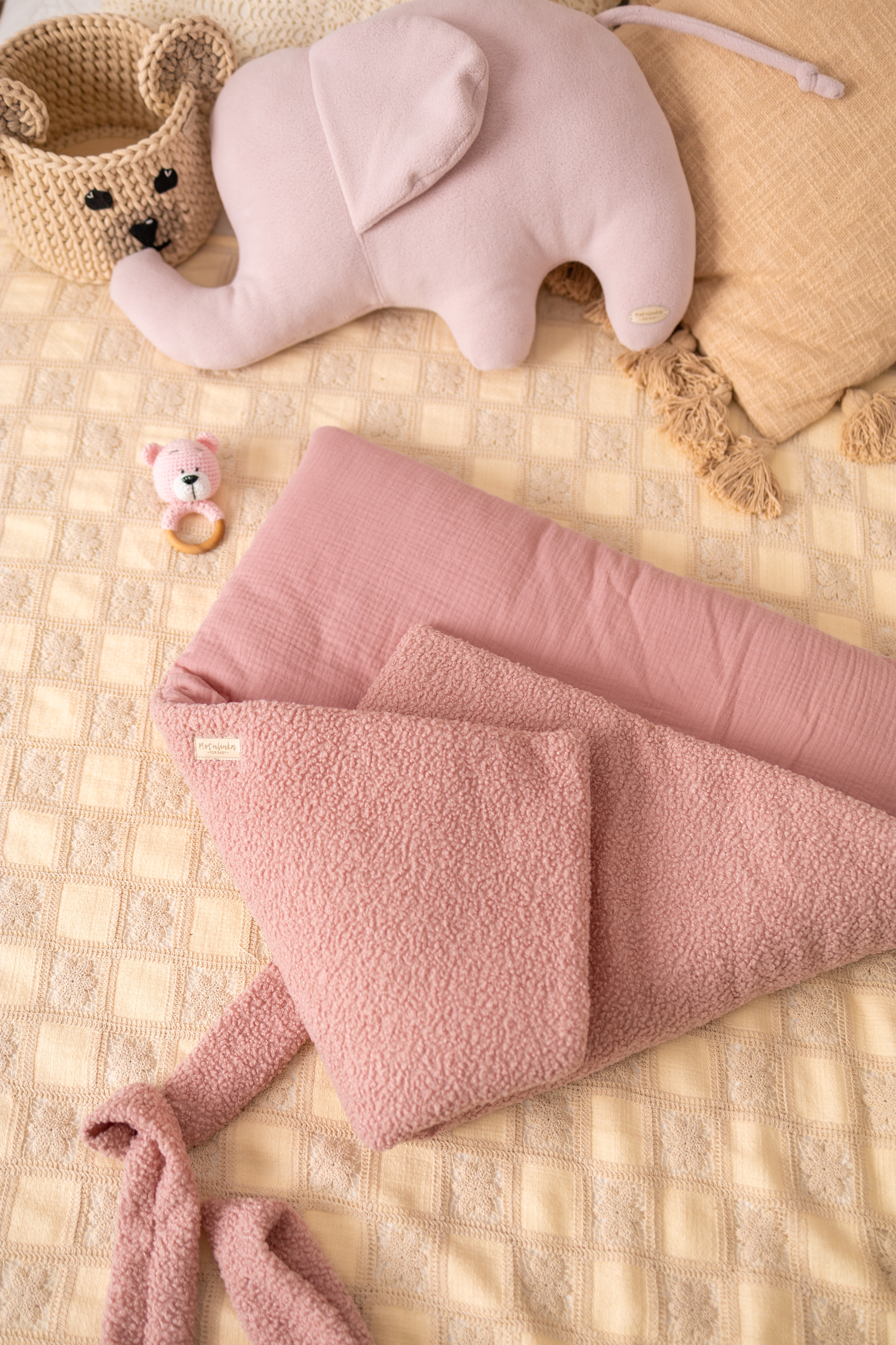 - Praktický design: Rozměr 75 × 75 cm, ideální do košíku pro miminko, postýlky či korbičky. Díky poutku lze upravit velikost podle potřeb dítěte.