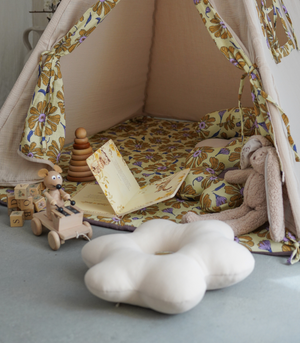 - Podložka součástí balení: Součástí je oboustranná mušelínová podložka, která poskytuje měkké a útulné místo pro sezení a hraní. Barevně ladí s teepee a dobře tlumí nerovnosti podlahy.