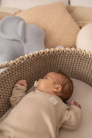 Háčkování z pevné 9mm bavlněné šňůry vytváří odolný a stabilní košík, zatímco pevné dřevěné dno zajišťuje rovný a bezpečný povrch – doporučený pro zdravý spánek novorozence. Součástí balení je také pohodlná pěnová matrace s bavlněným potahem.