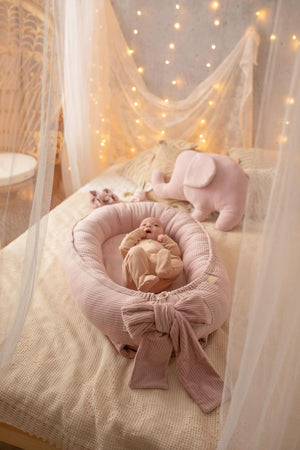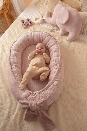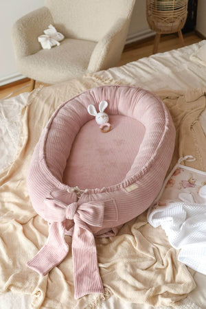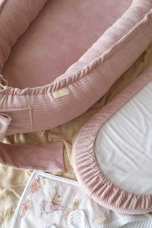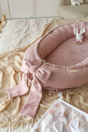 Ručně šité hnízdo pro miminka z měkkého manšestrového veluru – pudrově růžové