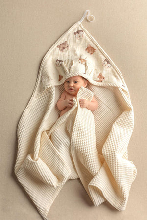 Dětská osuška z vaflové bavlny s kapucí – Forest Friends (100×100 cm)