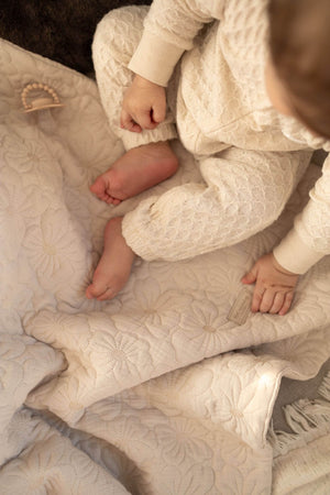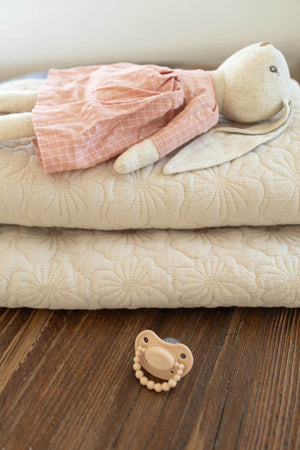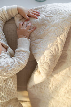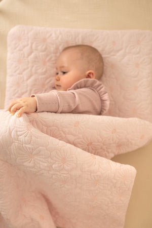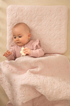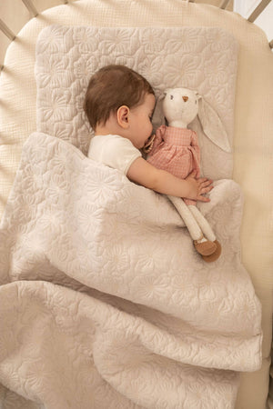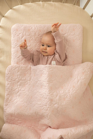 Mušelínová deka s lehkou výplní s motivem prošívaných kytiček spojuje jemnost přírodních materiálů, bezpečnost a nadčasový design. Praktická součást výbavičky pro teplejší měsíce.