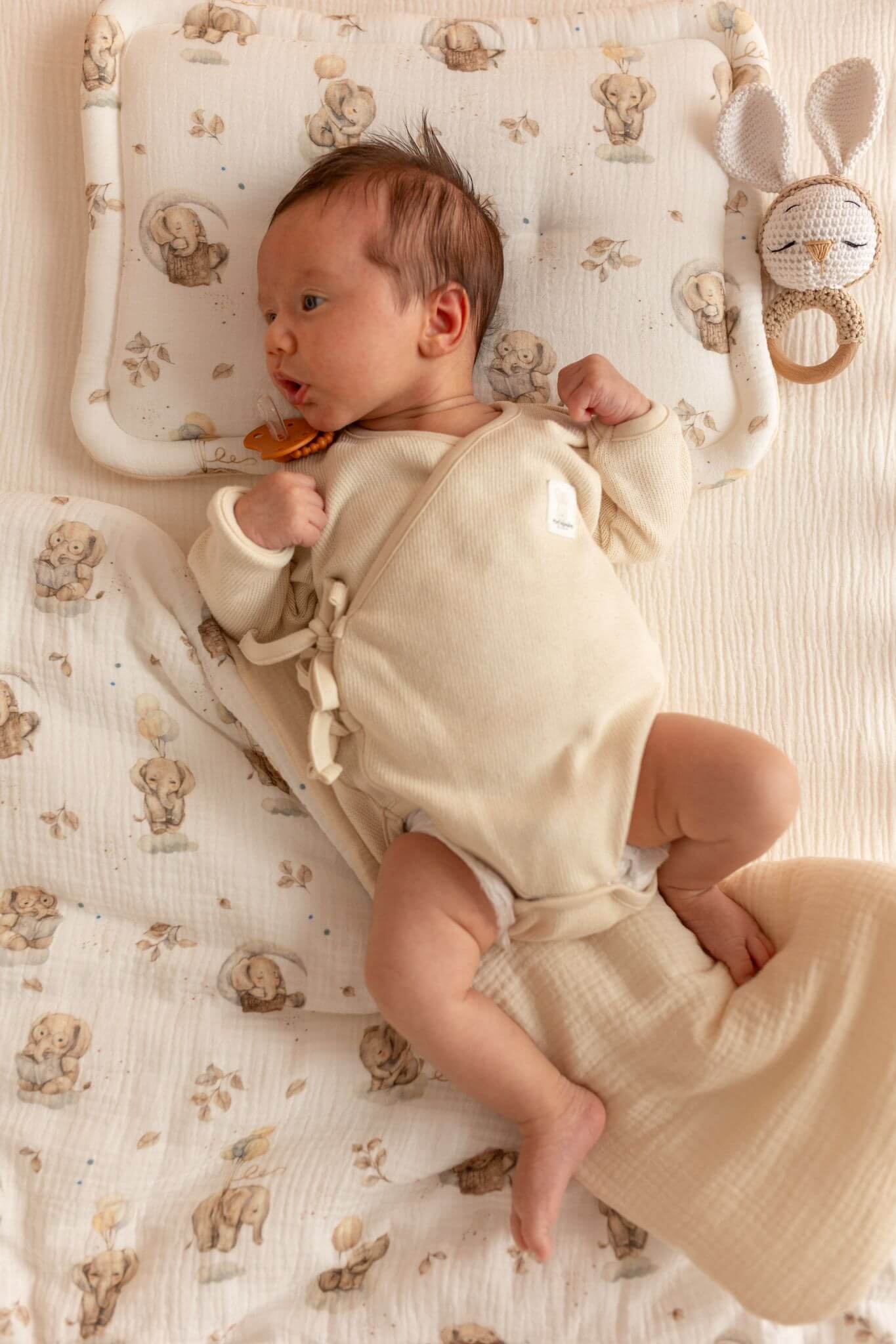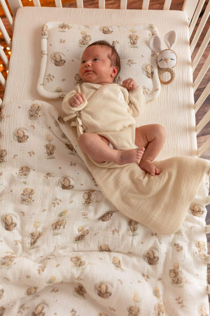 Z jedné strany se nachází mušelín s jemným motivem sloníků, z druhé klasický krémový mušelín. Oboustranné provedení dodává povlečení praktičnost i nadčasový vzhled, který snadno sladíte s dětským pokojíčkem.