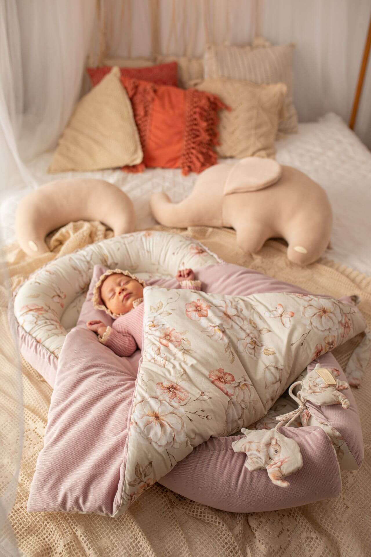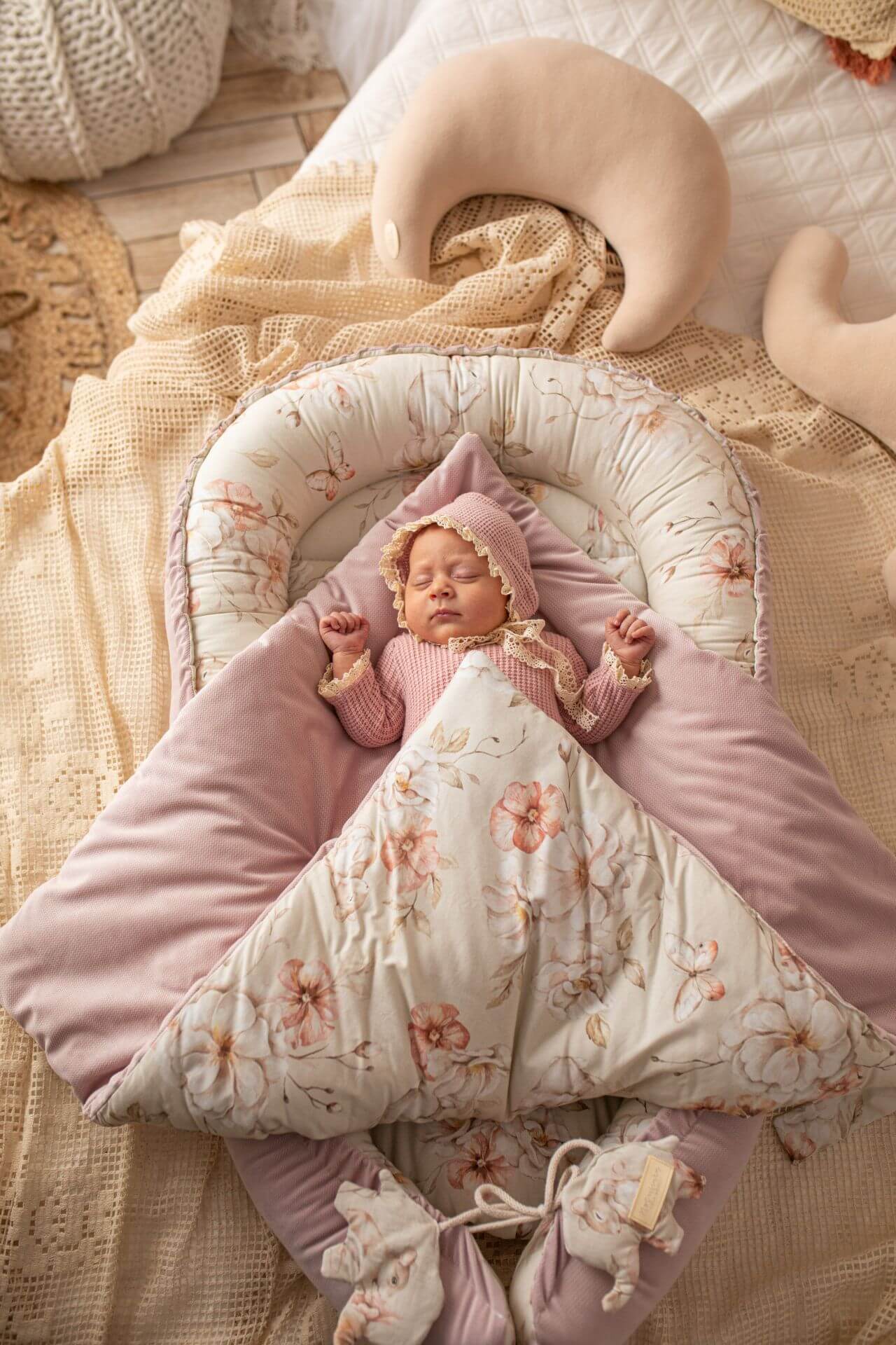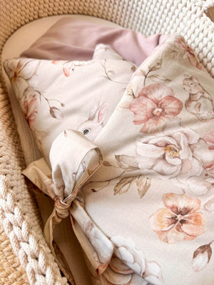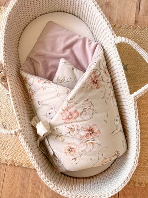 Zavinovačka pro novorozence – pastelová louka s pudrově růžovým sametem