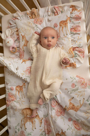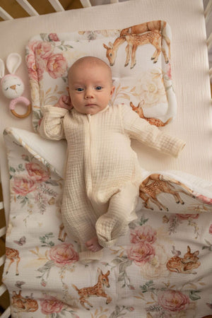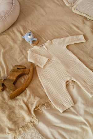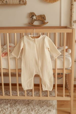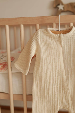 Naše lehké a měkké dětské overaly jsou navrženy tak, aby vašemu miminku poskytly maximální pohodlí. Jsou vzdušné a prodyšné, vyrobené z nejjemnějšího 100% organického bavlněného mušelínu s certifikací GOTS.